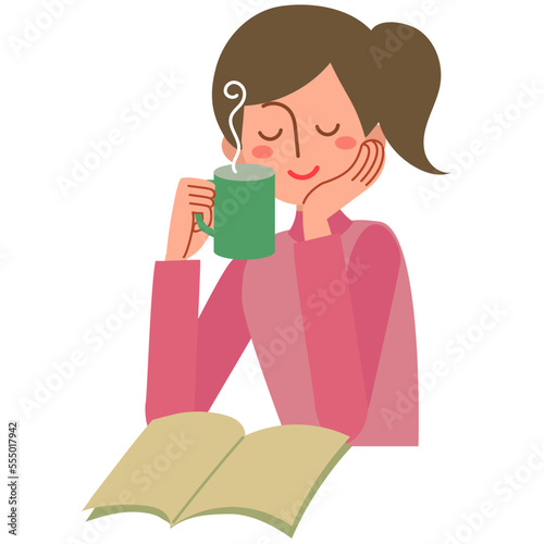 Fototapeta premium 温かい飲み物を片手に読書する若い女性の上半身