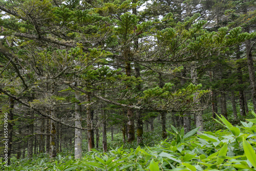 Obraz premium 蓼科山の景色 霧に霞む針葉樹林