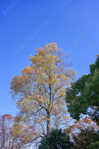 © Scott Mirror, Naklejka premium 青空バックに見上げるプラタナスの黄葉