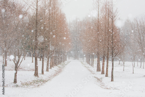 Obraz premium 눈내리는 메타쉐콰이어 길