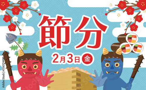 © motommy, Obraz premium かわいい鬼と豆まきと恵方巻の節分の日のベクターフレームイラスト素材_水色_横長