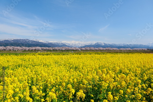 Obraz premium 春の四重奏として知られる舟川べり桜並木。朝日、富山、日本。4月中旬。