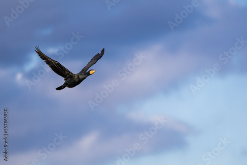 Obraz premium 夕暮れの空を飛ぶカワウ