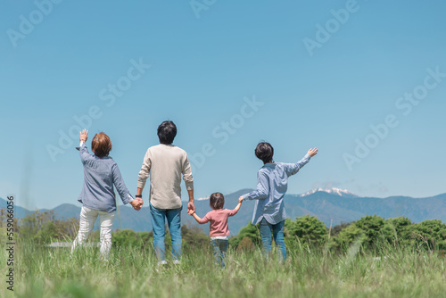 Fototapeta premium 空と高原・草原・公園で手を繋ぐアジア人の三世代家族・親子・ファミリーの後ろ姿