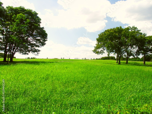 © smtd3, Fototapeta premium メヒシバとオヒシバの草原と立ち木のある初秋の水元公園風景
