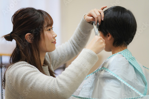 Obraz premium 子供の髪を切る母親
