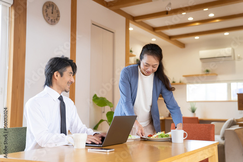 Fototapeta premium 仕事をする男性と食事を運ぶ女性