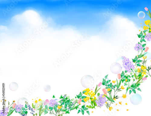 © MerciArtworks, Fototapeta premium ポップで優しい色使いのオシャレな水彩画植物とシャボン玉ー雲のある青空の白バックフレームイラスト素材
