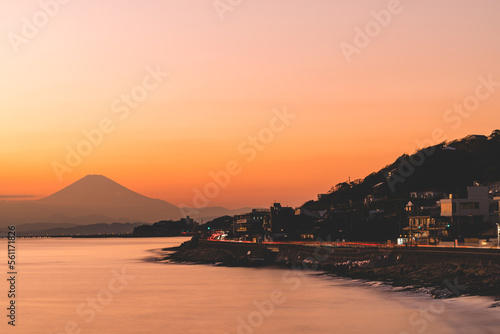 © Kengo/ けんご, Fototapeta premium 夕焼け空と江ノ島から見える富士山