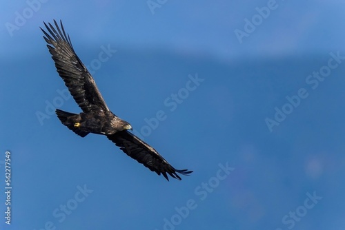 Obraz premium 青い山並みをバックに獲物を探して旋回するイヌワシ成鳥