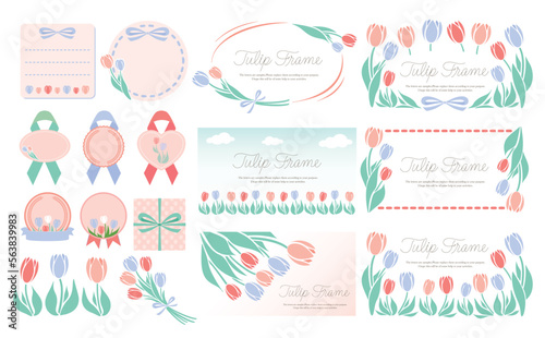 © motommy, Obraz premium シンプル可愛い春のお花のチューリップフレームとイラストのセットベクター素材_赤色青色_横長