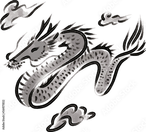 © ribbon_s, Obraz premium 2024 干支 辰年 辰 龍 たつ 竜 手描き 墨絵 水墨画 年賀状素材 イラスト素材