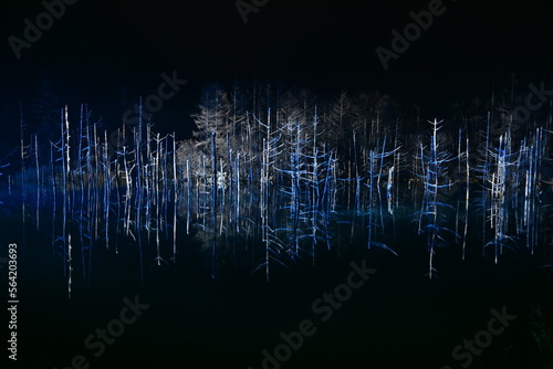 © Raicho, Fototapeta premium 雪の降る冬にライトアップされる幻想的で美しい青い池