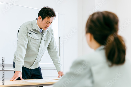 Obraz premium 工場・会社・オフィス・会議室で会議・セミナー・勉強会に参加するエンジニア・技術者・作業員の男性
