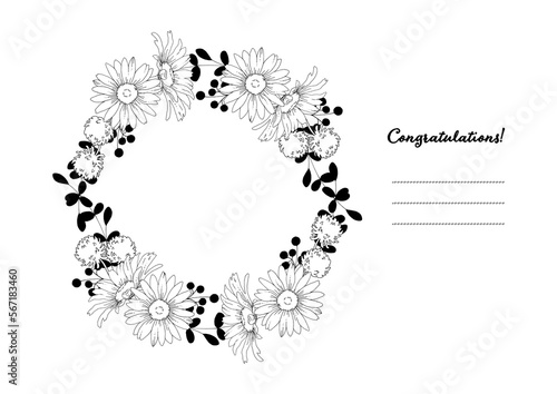 © 時々雨, Obraz premium 花の手描き線画のお祝いカードテンプレート