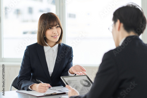 © mapo, Obraz premium タブレットを見せて説明するアジア人ビジネスウーマン