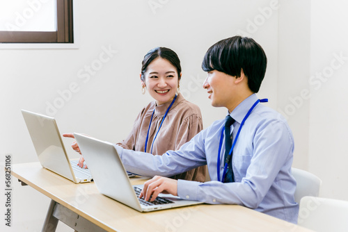 © buritora, Obraz premium 会社のオフィス・会議室でミーティング・会議・打ち合わせするビジネスウーマンとビジネスマン(アジア人)