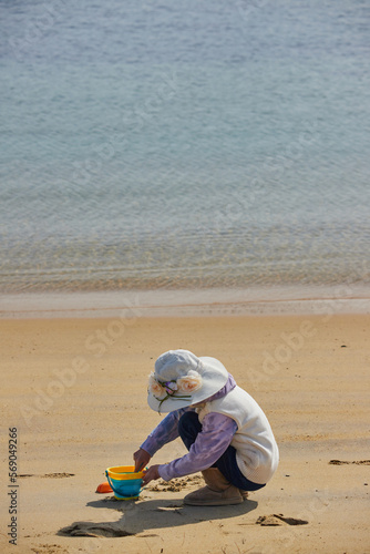 © zheng qiang, Obraz premium 冬の海岸のビーチで砂遊びしている小学生の女の子の様子