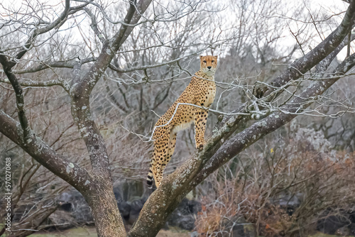 Obraz premium 大自然で狩りをして木の上に登る野生動物のチーター