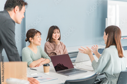 Obraz premium オフィス・会議室で会議・ミーティング・打ち合わせするビジネスウーマン