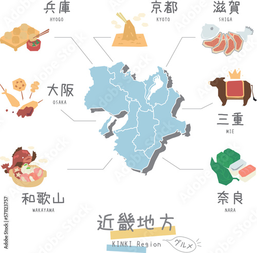 © ribitts, Naklejka premium 日本の近畿地方のグルメ観光とマップ、アイコンのセット(フラット)