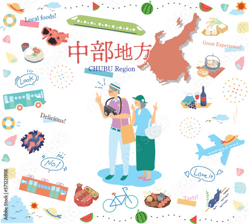 Fototapeta premium 日本の中部地方の夏のグルメ観光を楽しむシニア夫婦、アイコンのセット(フラット)