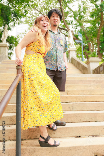 Naklejka premium 階段の手すりに寄り添い肩を並べる男女
