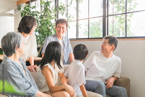 Fototapeta premium 家のソファで家族団欒する三世代家族・ファミリー