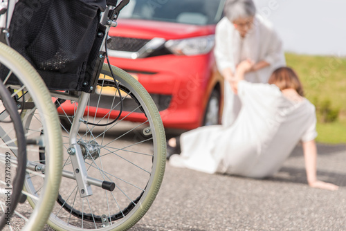 Fototapeta premium 交通事故を起こした高齢者と被害者の女性