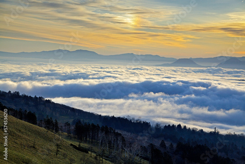 Obraz premium 屈斜路湖の雲海と朝焼けの幻日(美幌峠より)