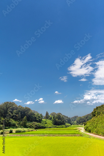 Obraz premium 谷間にある稲田の田舎風景。背景素材