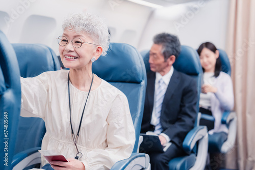 © maroke, Obraz premium 機内エンターテイメントを楽しむ高齢の女性