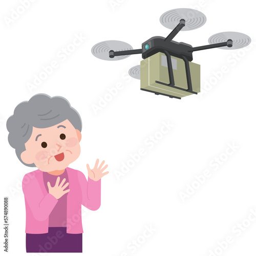 Obraz premium 宅配便を届ける運搬ドローン 助かる高齢女性 イラスト