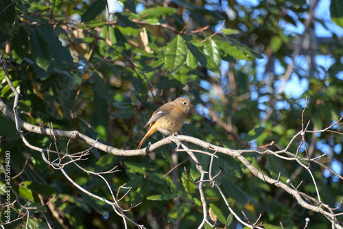 Fototapeta premium 葉っぱが散った枝にとまり、木漏れ日に照らされた雌のジョウビタキ