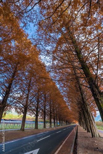 Fototapeta premium 日本 滋賀県高島市マキノ町の秋になって紅葉したメタセコイア並木