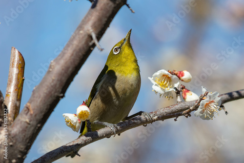 © yukikazechihayate, Naklejka premium 花の蜜を吸うのを中断して猛禽を警戒するメジロ