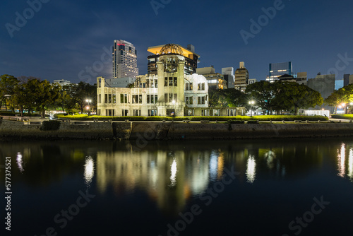 Fototapeta premium 日本 広島県広島市にあるライトアップされた原爆ドームと元安川の夜景