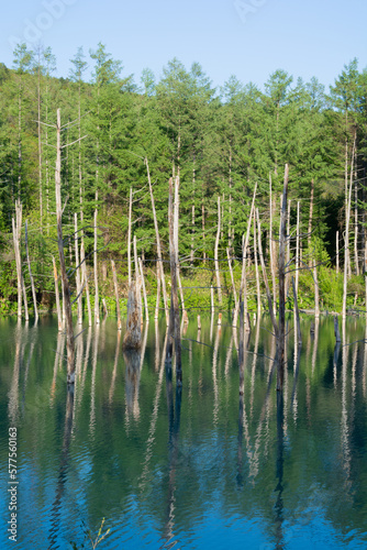 © kinpouge, Obraz premium 春の青空を映す青い池の水面 美瑛町