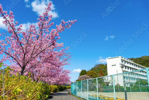 Obraz premium 河津桜と校舎(入学・卒業イメージ)