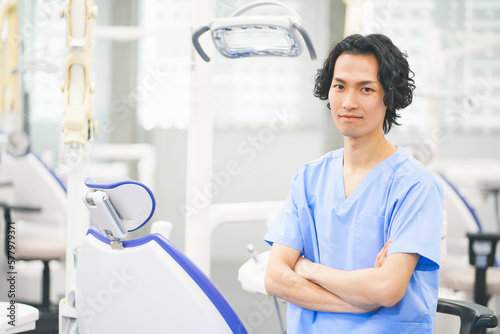 © HML, Obraz premium 歯科治療ユニットの前で腕組みをする若い男性歯科医師