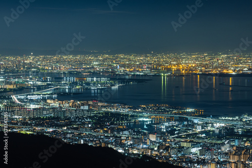 Obraz premium 日本 兵庫県神戸市の六甲山天覧台から眺める大阪市街地の夜景と大阪湾