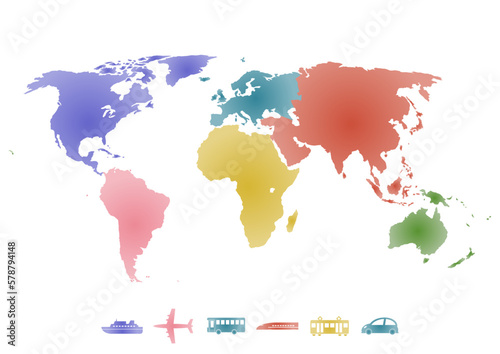 © osame, Fototapeta premium 世界地図のイラスト: 六大州と交通機関アイコン