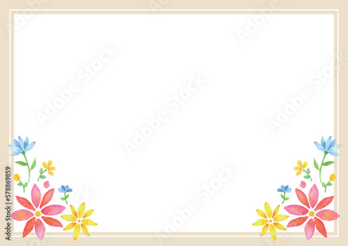 Obraz premium 左右下に赤青黄色の水彩手描きの花飾り付いた横型フレーム