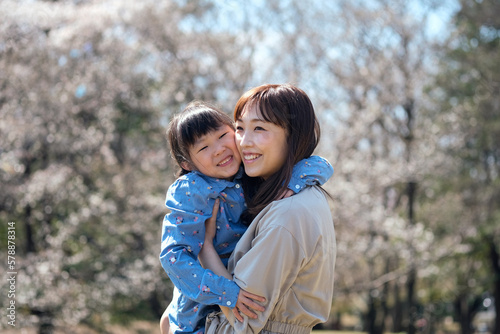 Fototapeta premium 桜の咲く公園で遊ぶ母と娘