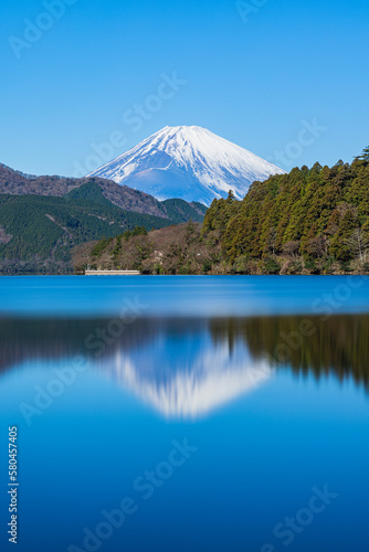 Fototapeta premium 日本 神奈川県足柄下郡箱根町の芦ノ湖の水面に反射して映っている富士山