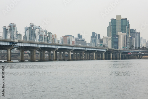 Naklejka premium 汝矣島漢江公園から眺める漢江と麻浦大橋