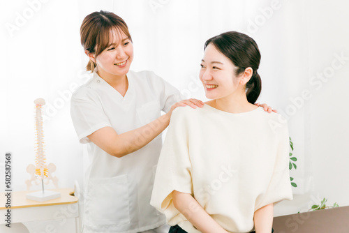 Fototapeta premium 整骨院・接骨院で診察・相談・カウンセリングする整体師・・マッサージ師・セラピストの女性(腰痛)
