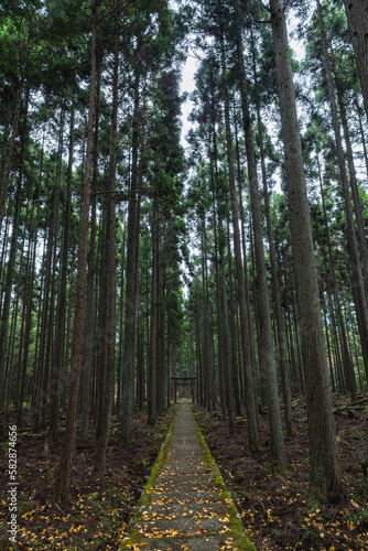 Fototapeta premium 日本 京都府京都市右京区の森の中にある賀茂神社の社殿から鳥居まで続く石段と銀杏の落ち葉