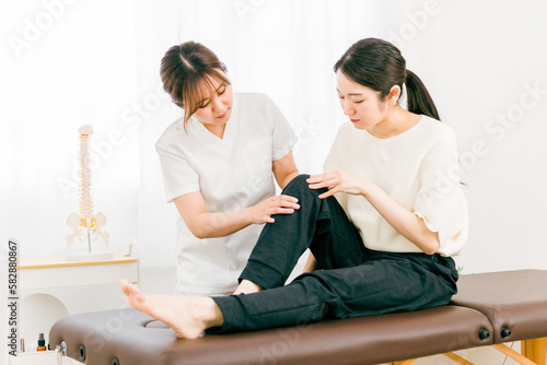Obraz premium 整形外科・整体院に膝・足の怪我の治療にきた患者と整体師・マッサージ師・セラピスト・医師の女性