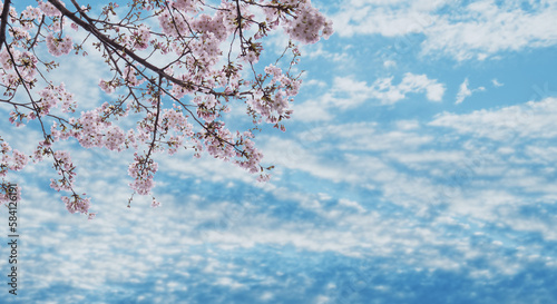 Obraz premium 春の空を望み見上げる満開の桜と空雲の背景 新年度・入学・入社・入園・卒業のイメージ